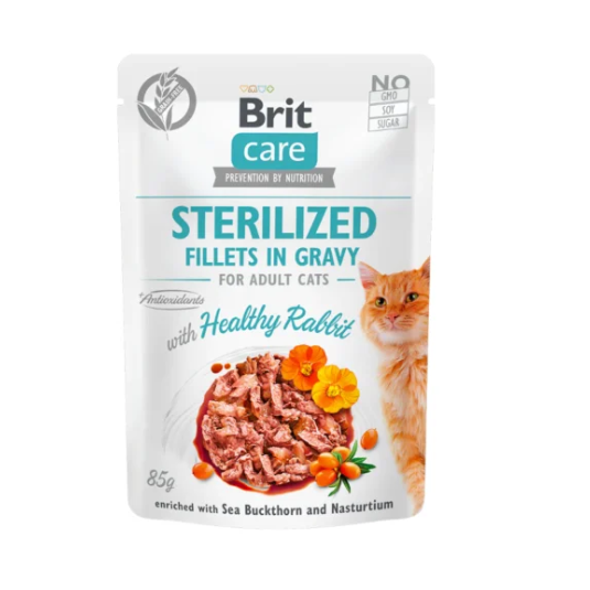 Brit Care – Filets au Lapin en Sauce pour Chats Stérilisés | 85 g Sans Céréales, Enrichi en Argousier et Capucine